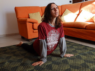 Sdraiati sulla pancia con le mani vicino al petto e le dita rivolte verso l'esterno e poi sollevati sulle braccia mantenendole tese. Lascia il bacino a terra e solleva il capo verso l'alto.