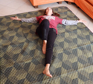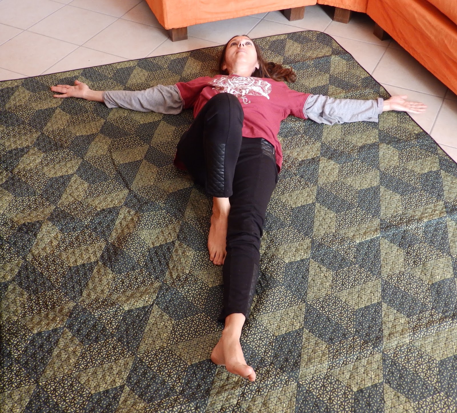 Sdraiati a terra, braccia allargate con i palmi rivolti verso l'alto, gamba destra piegata, piede in appoggio a terra.