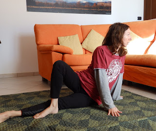 Sposta il bacino verso sinistra, flettendo leggermente il ginocchio destro; ruota le spalle mantenendo le braccia tese, prima verso destra e poi verso sinistra, mantenendo ogni volta la posizione per 3 respirazioni.