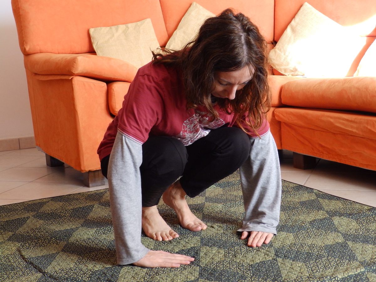 Dalla posizione in piedi, accovacciati mantenendo piedi e ginocchia vicine, talloni sollevati, mani a terra con le dita leggermente in dentro, braccia morbide, collo rilassato e testa a penzoloni.